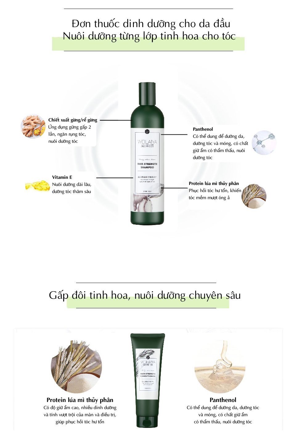 – Triple Ginger + tỷ lệ phù hợp của sáu loại thực vật quý Xuyên khung, Bạch tiên, Khổ sâm, Cinchona Pubescens, Hoàng liên cùng công thức dầu gội axit yếu (gần giá trị pH của da đầu), phục hồi hệ sinh thái khoẻ mạnh của da đầu, dưỡng ẩm, giúp cân bằng nước và dầu, đem lại mái tóc dầy khoẻ.