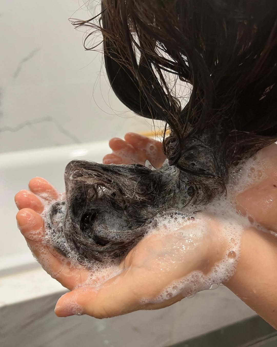 - Lấy một lượng dầu gội vừa đủ, tạo bọt trong lòng bàn tay.