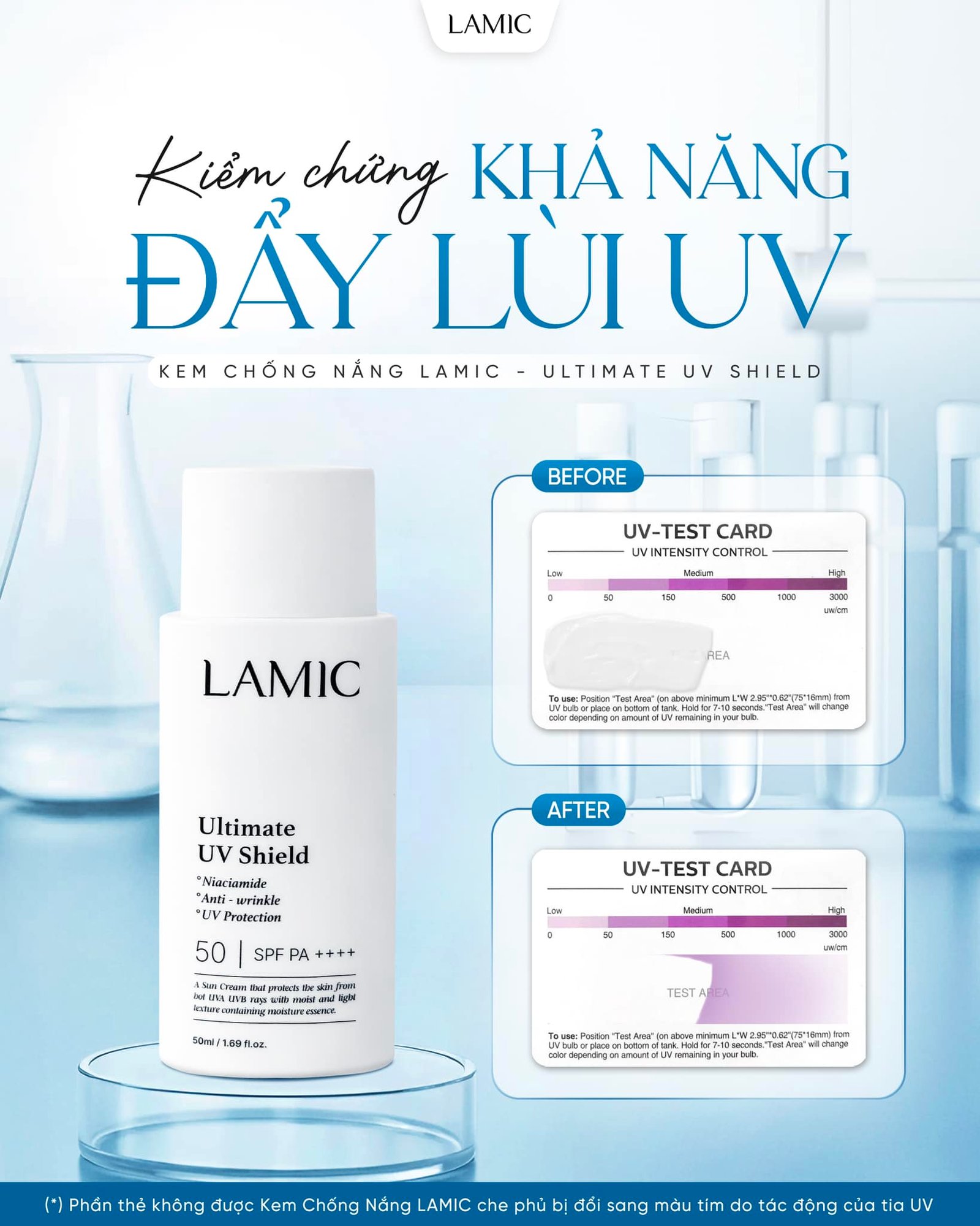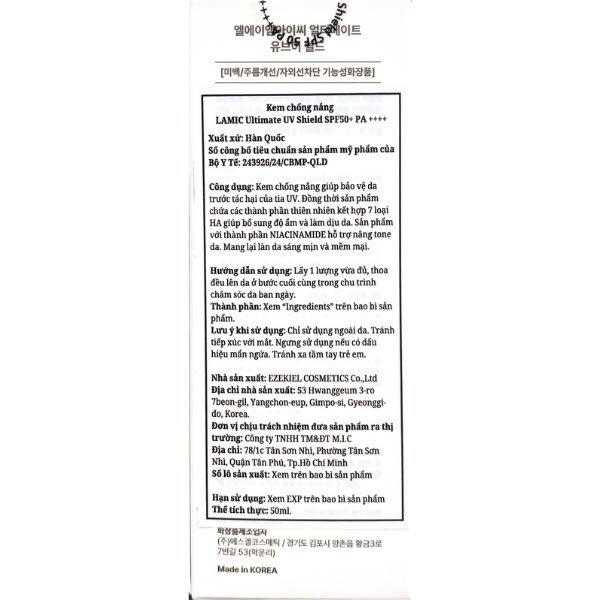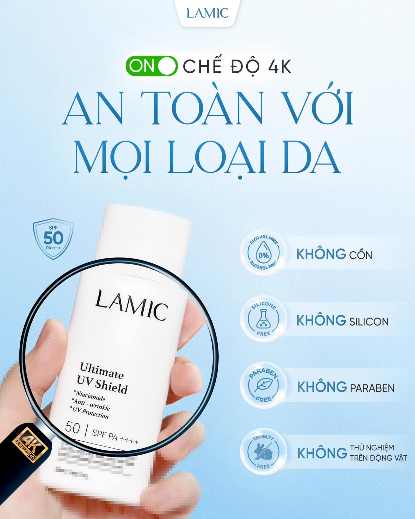 Kem Chống Nắng Dưỡng Ẩm, Hỗ Trợ Làm Sáng Da LAMIC ULTIMATE UV SHIELD SPF50+ PA++++ là dòng kem chống nắng dưỡng ẩm thuộc thương hiệu LAMIC đến từ Hàn Quốc. Với chỉ số chống nắng SPF50+ PA++++ bảo vệ da tối ưu, kết hợp với thành phần chiết xuất từ tự nhiên an toàn dịu nhẹ với làn da, dưỡng da mịn màng và trắng hồng tự nhiên. Đồng thời, ngăn ngừa lão hóa do UV như đốm nâu, thâm nám, tàn nhang.