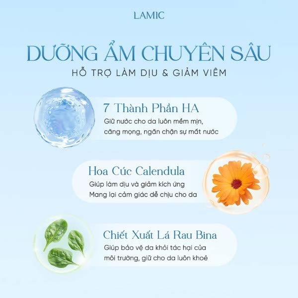 - 7 thành phần HA: giúp da luôn mềm mịn và căng mọng, tạo ra một lớp màng bảo vệ, ngăn chặn sự mất nước và giữ cho da luôn ẩm mượt suốt ngày dài.