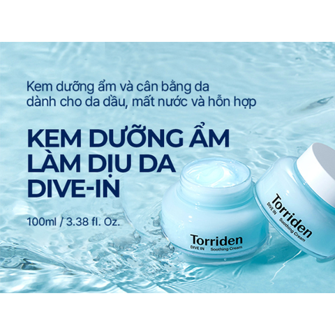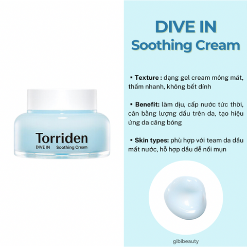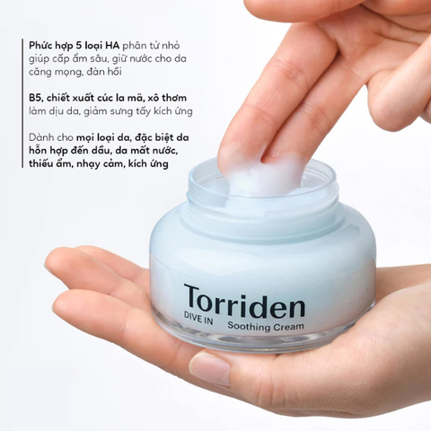 Torriden Dive In Soothing Cream là một sản phẩm kem dưỡng ẩm chuyên sâu được thiết kế để cung cấp độ ẩm tối đa cho làn da. Với thành phần chính là Hyaluronic Acid phân tử thấp, sản phẩm giúp thẩm thấu nhanh và cung cấp độ ẩm sâu cho da, mang lại cảm giác dễ chịu và mịn màng.