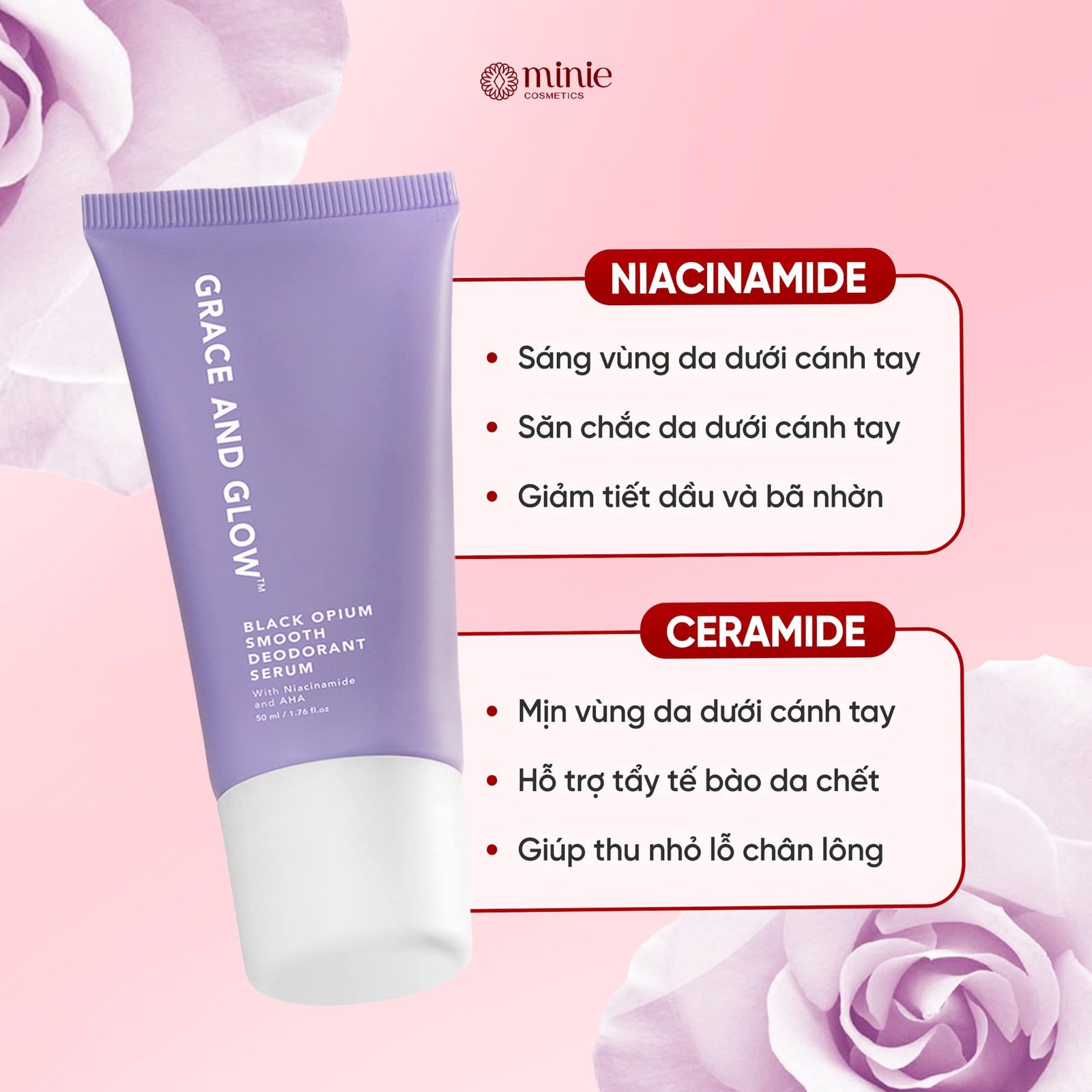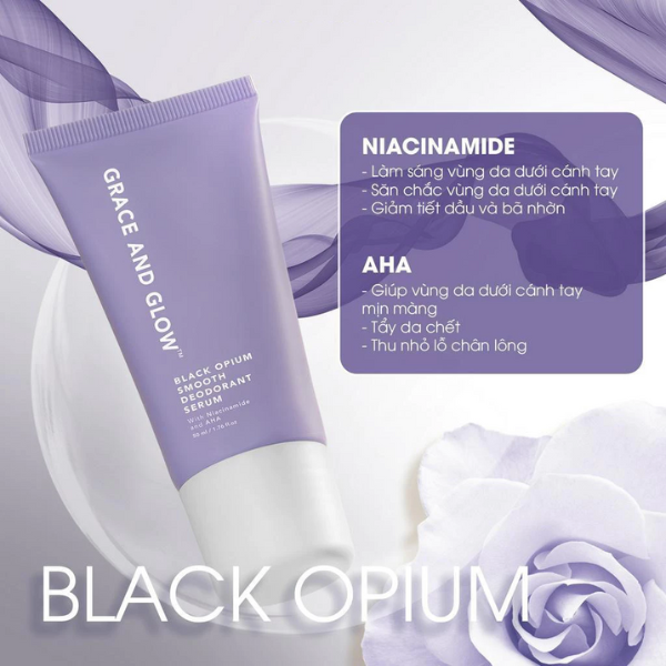 Lăn khử mùi Grace and Glow Black Opium với công thức chứa Niacinamide và AHA, sản phẩm không chỉ ngăn ngừa mồ hôi mà còn giúp làm sáng và mịn màng vùng da dưới cánh tay.