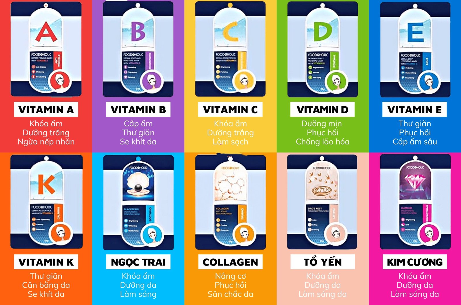 ▪️ Mặt nạ vitamin E Foodaholic: Vitamin E kết hợp cùng HA giúp da giữ ẩm gấp 100 lần, cấp nước chuyên sâu cho da.