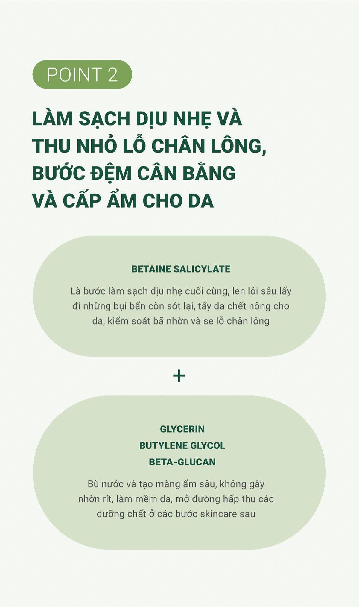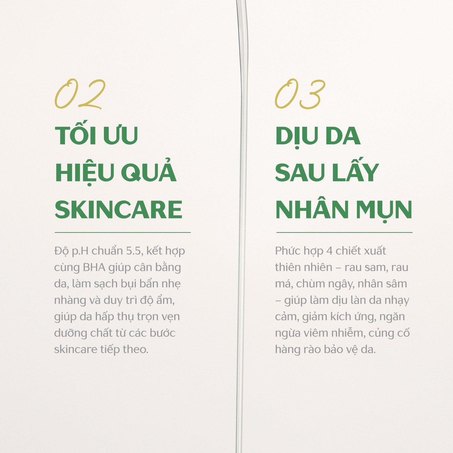 Chiết xuất từ rau sam, rau má, chùm ngây, nhân sâm và BHA giúp làm dịu, kháng viêm, kiểm soát dầu nhờn mà không gây khô da hay kích ứng.