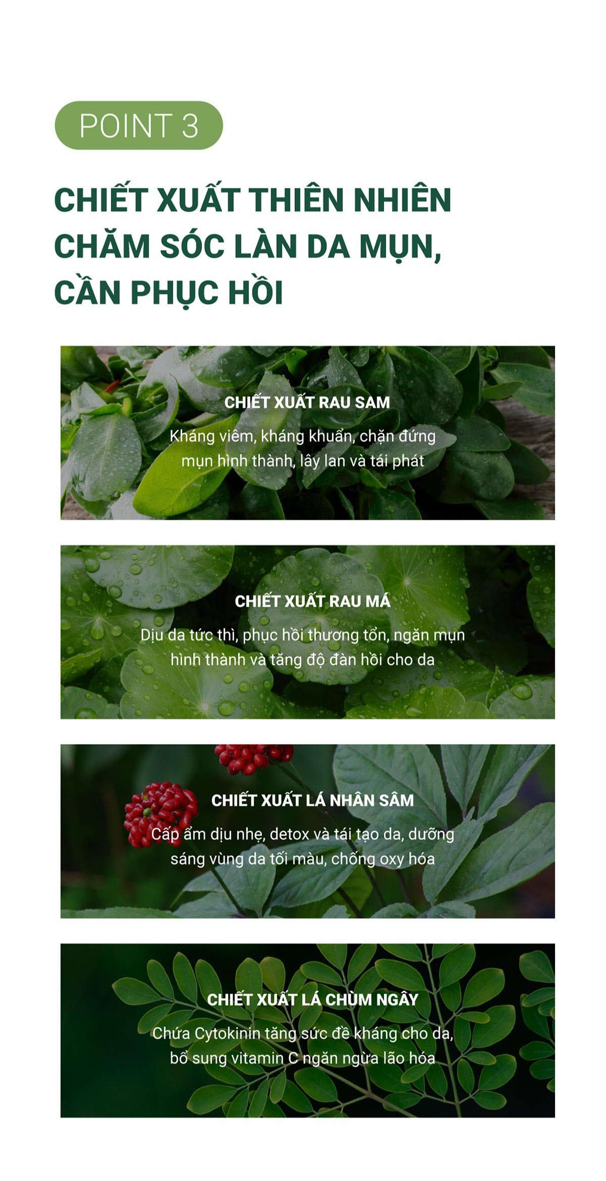 Rau sam, rau má, chùm ngây: Làm dịu, cấp ẩm, chống lão hóa và kháng viêm mạnh mẽ. Hỗ trợ hồi phục tổn thương da, đặc biệt ở vùng da đang bị mụn.