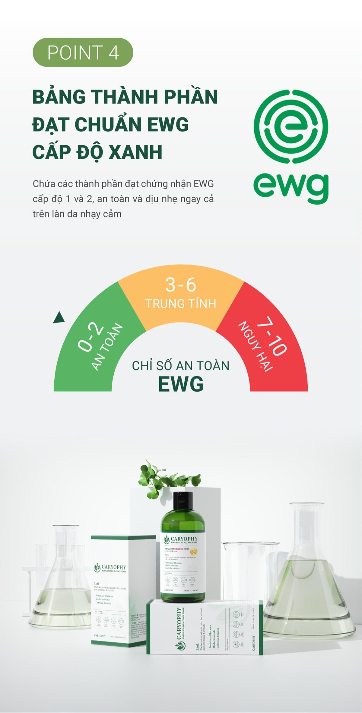 Nói không với cồn, paraben, dầu khoáng, sulfate, giúp sản phẩm an toàn tuyệt đối với cả làn da nhạy cảm nhất. Đã được chứng nhận EWG cấp độ Xanh – an toàn cho mọi loại da.