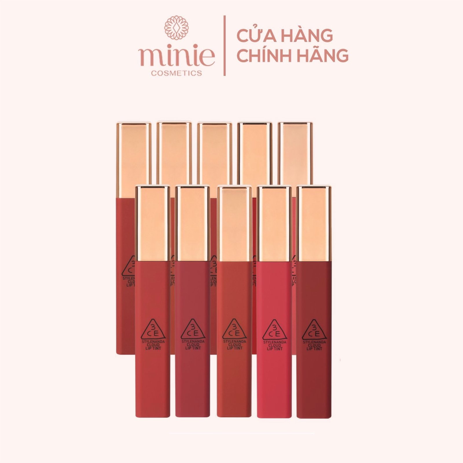 – Son kem lì 3CE Cloud Lip Tint có thiết kế nổi bật với thân son trùng màu với màu son bên trong và nắp son có màu ánh đồng đơn giản nhưng vẫn tinh tế, sang trọng