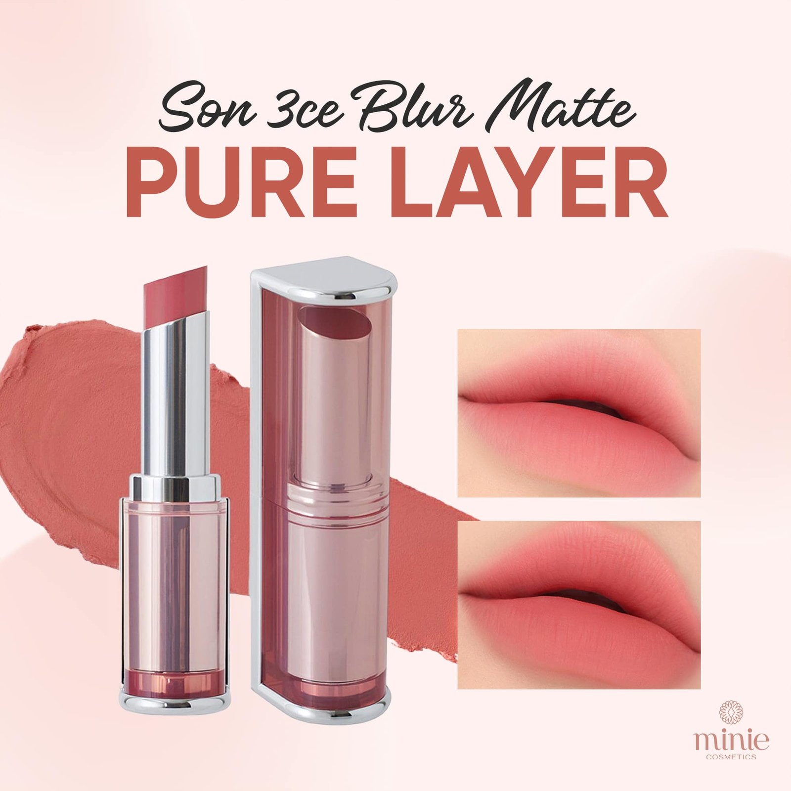 Siêu phẩm son 3CE Blur Matte Lipstick với thiết kế độc lạ hình Parabol cùng chất son mềm mịn. Với công thức từ bột đàn hồi silicon, thỏi son nhẹ nhàng lướt trên môi, cho lớp nền môi nhẹ thoáng, mịn lì, cảm giác như không đánh son, tạo hiệu ứng mịn lì, mờ ảo, nhẹ tênh trên môi. Hiệu ứng “Breathing Matte” làm mờ những nếp rãnh môi, cho bề mặt môi phẳng như lớp thảm nhung, finish lì mờ mịn màng nhưng không làm môi bị khô căng, ngược lại trông môi đầy đặn và ráo mướt. Từ đó giúp che đi khuyết điểm môi một cách tự nhiên, không làm lộ vân môi và gây khô môi.