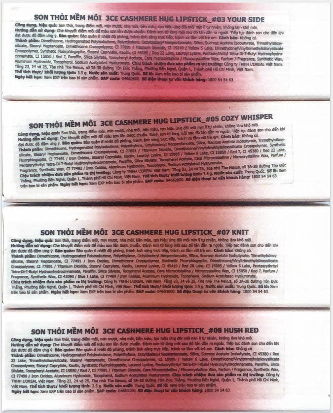 Son 3CE Cashmere Hug Lipstick chứa các thành phần nổi bật như Dimethicone, Hydrogenated Polyisobutene, Silica và nhiều dưỡng chất khác giúp môi mềm mại, giữ màu lâu trôi. Thành phần có thể thay đổi nhẹ tùy theo từng sắc son, đảm bảo an toàn và lên màu chuẩn.