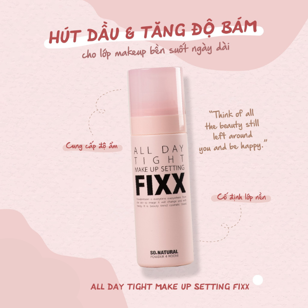 All Day Tight Make Up Setting FIXX là sản phẩm xịt khóa lớp trang điểm, giúp giữ lớp make up bền lâu suốt cả ngày, ngay cả trong điều kiện thời tiết nóng ẩm khó chịu. Với thiết kế tiện lợi và công thức đặc biệt, sản phẩm này đã nhận được nhiều giải thưởng từ các tạp chí và tổ chức uy tín trong ngành làm đẹp.